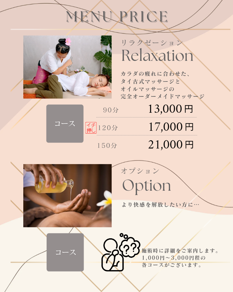 オプションの有無によって、お時間と料金が変動いたしますので、あらかじめご了承ください。